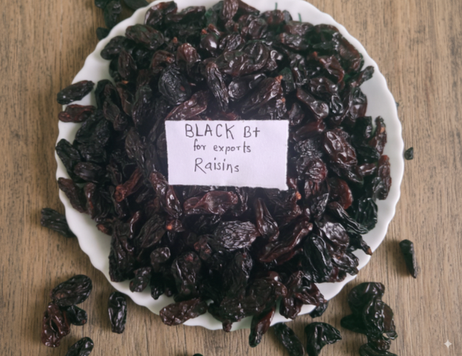 Black B+ Raisins are high-quality sun-dried black raisins with a deep dark color, natural sweetness, and firm texture. These seedless grapes are sourced from trusted Indian vineyards and are cleaned, graded, and packed under hygienic conditions. These export-grade raisins are perfect for wholesalers, food manufacturers, bakeries, wine industry, medicine industry and global markets suitable for confectionery, baking, cooking, and dry fruit mixes; they ensure consistent quality and a long shelf life. They are slightly smaller than premium grades but still maintain excellent taste and nutrition, making them a cost-effective choice for bulk exports.
